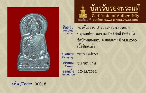 พระคันธราช ปางประทานพร รุ่นแรก ปลุกเสกโดย หลวงพ่อกิตติศักดิ์ กิตฺติสาโร วัดป่าหนองหลุบ จ.ขอนแก่น ปี พ.ศ.2545 เนื้อชินตะกั่ว |